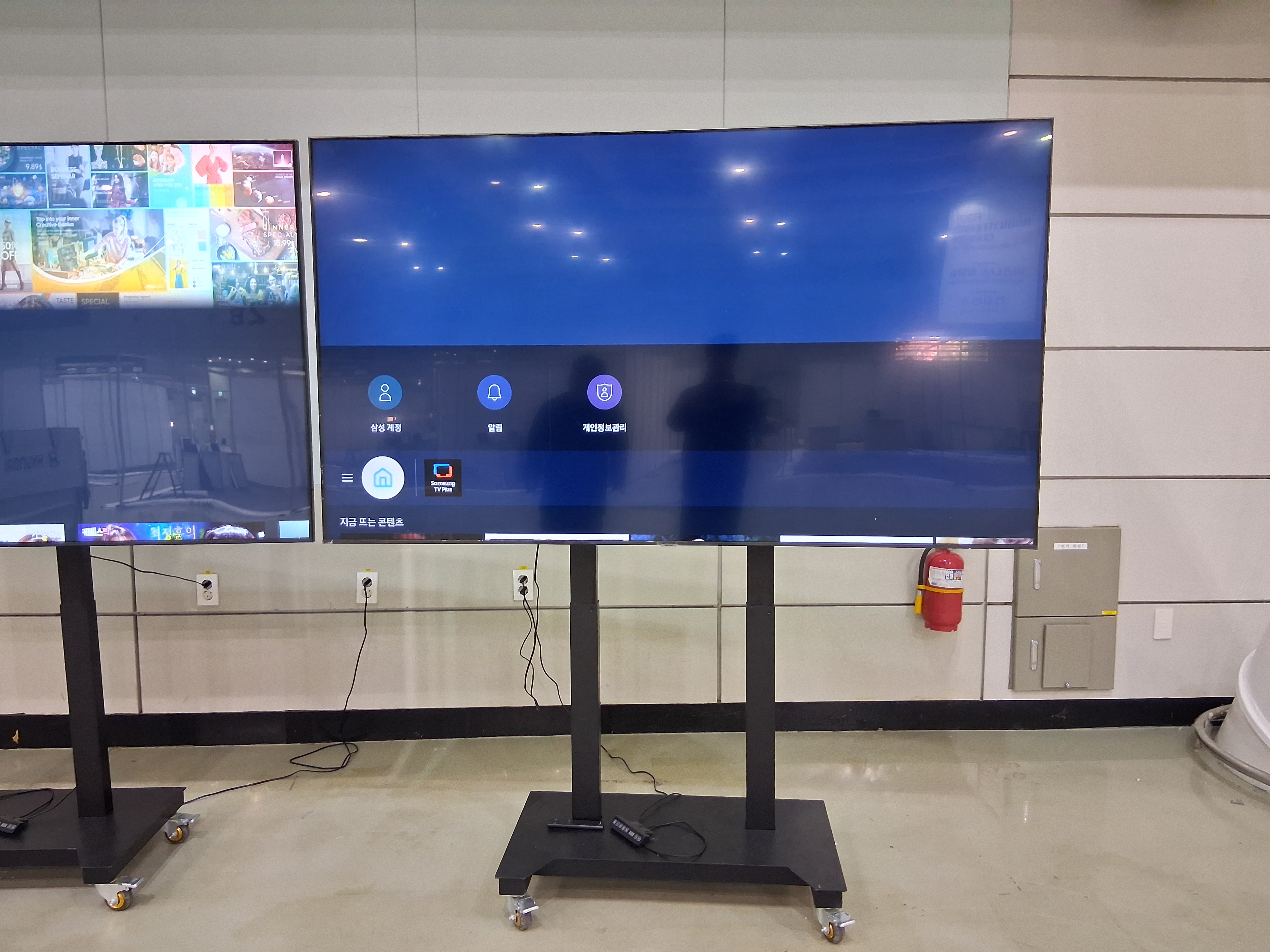 현장에 도착하자마자 부스 위치를 확인하고, 바닥 보양 작업부터 꼼꼼히 진행했습니다. 85인치 TV는 크기도 크기지만 무게가 상당하고 패널이 민감하기 때문에, 전문가가 아니면 운반조차 쉽지 않습니다. 저희 팀원들이 호흡을 맞춰 안전하게 스탠드에 거치하는 순간, 주변 부스 관계자분들도 "와, 화면 진짜 크다"라며 쳐다보시더라고요. (이럴 때 참 뿌듯합니다.)