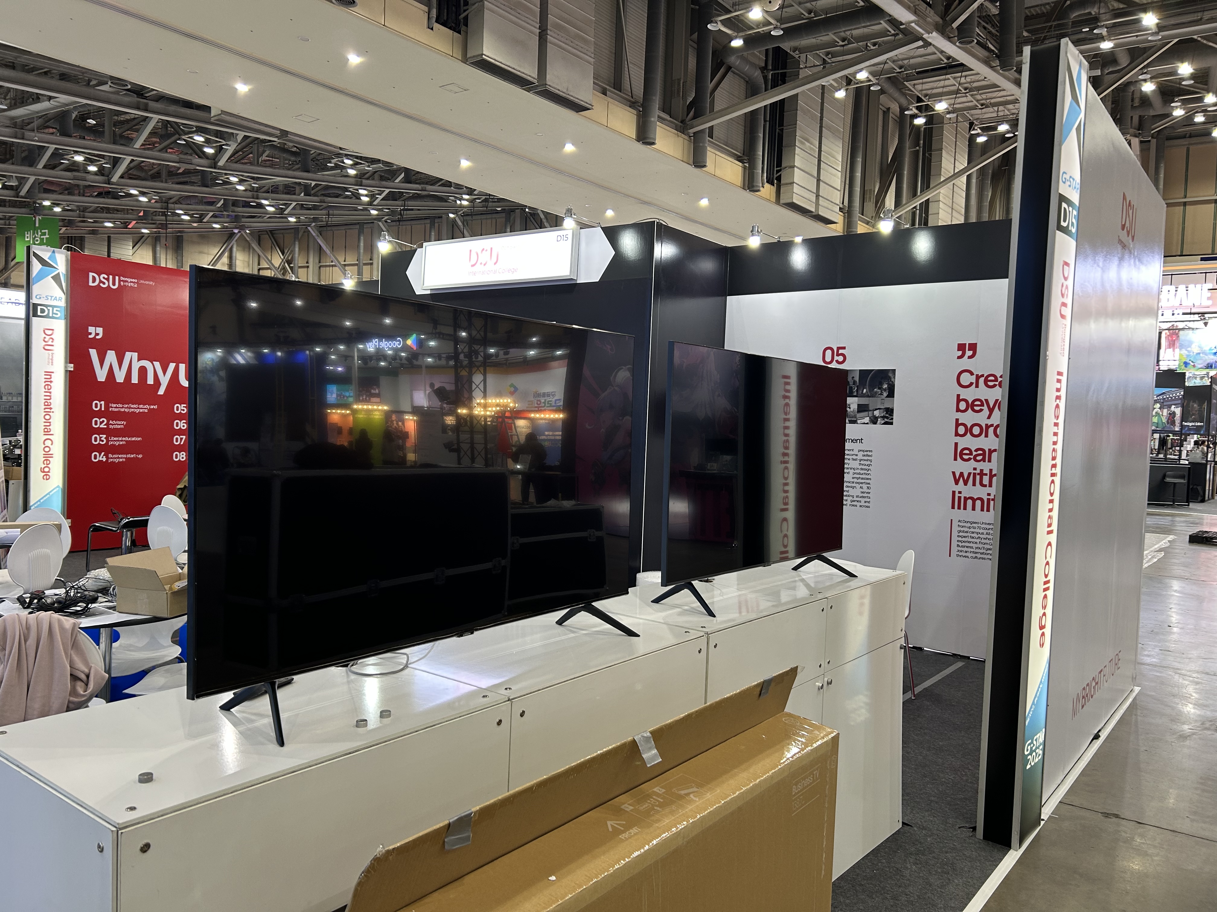 이번 2025 지스타에서 저희가 공급한 장비는 게이밍 컴퓨터 50여 대, TV와 모니터 70여 대였습니다.