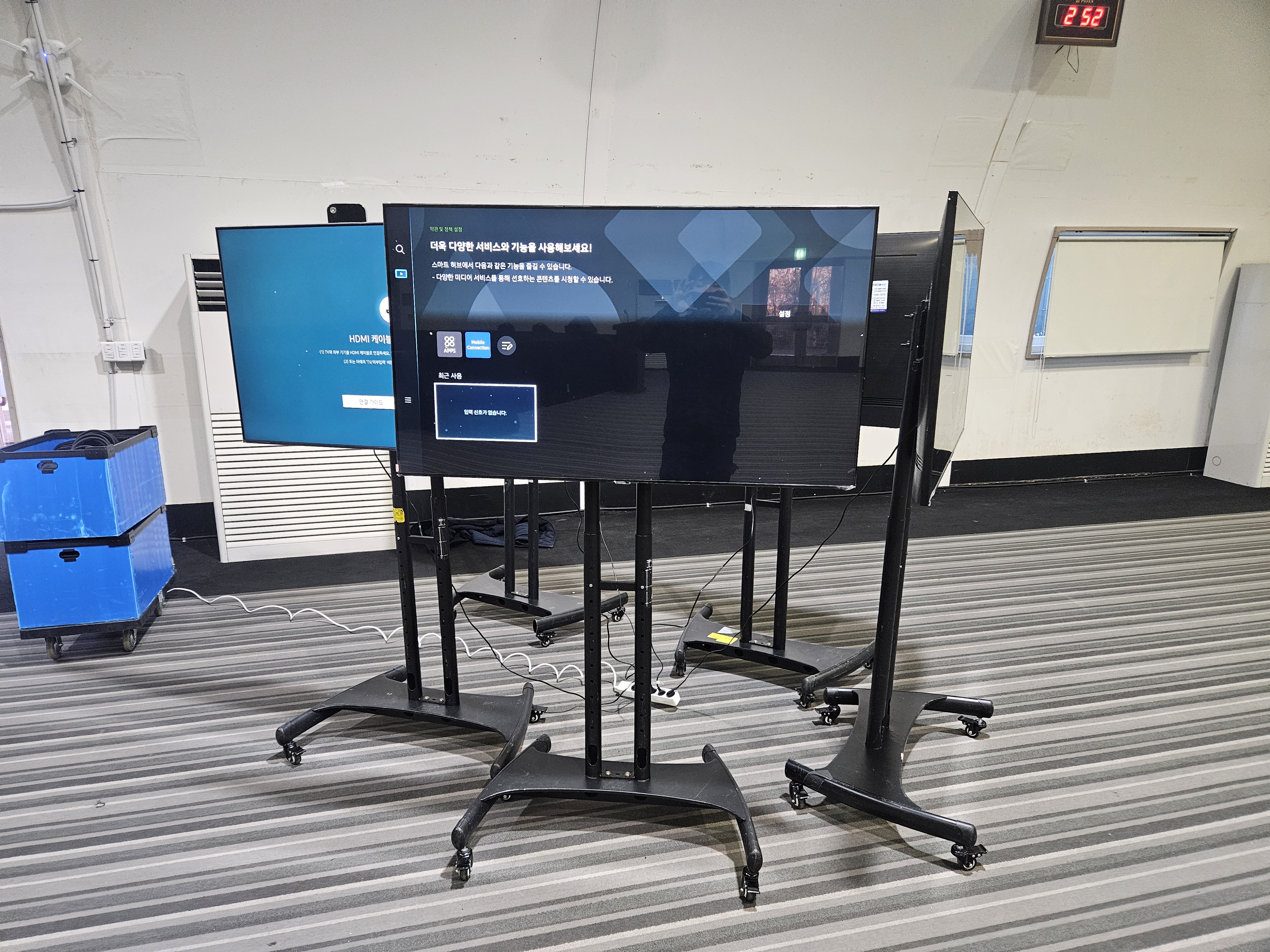 이동형 스탠드에 55인치 TV를 거치한 모습입니다. 행사장은 사람들이 많이 오가는 곳이기 때문에안전이 최우선입니다.