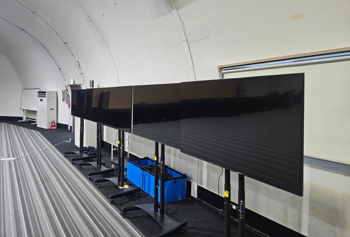 설치가 완료된 5대의 TV를 일렬로 세워두고 최종 테스트를 진행했습니다. 각 TV마다 화면 밝기는 균일한지, 불량 화소는 없는지, 노트북과 연결했을 때 딜레이는 없는지 하나하나 직접 눈으로 확인합니다.