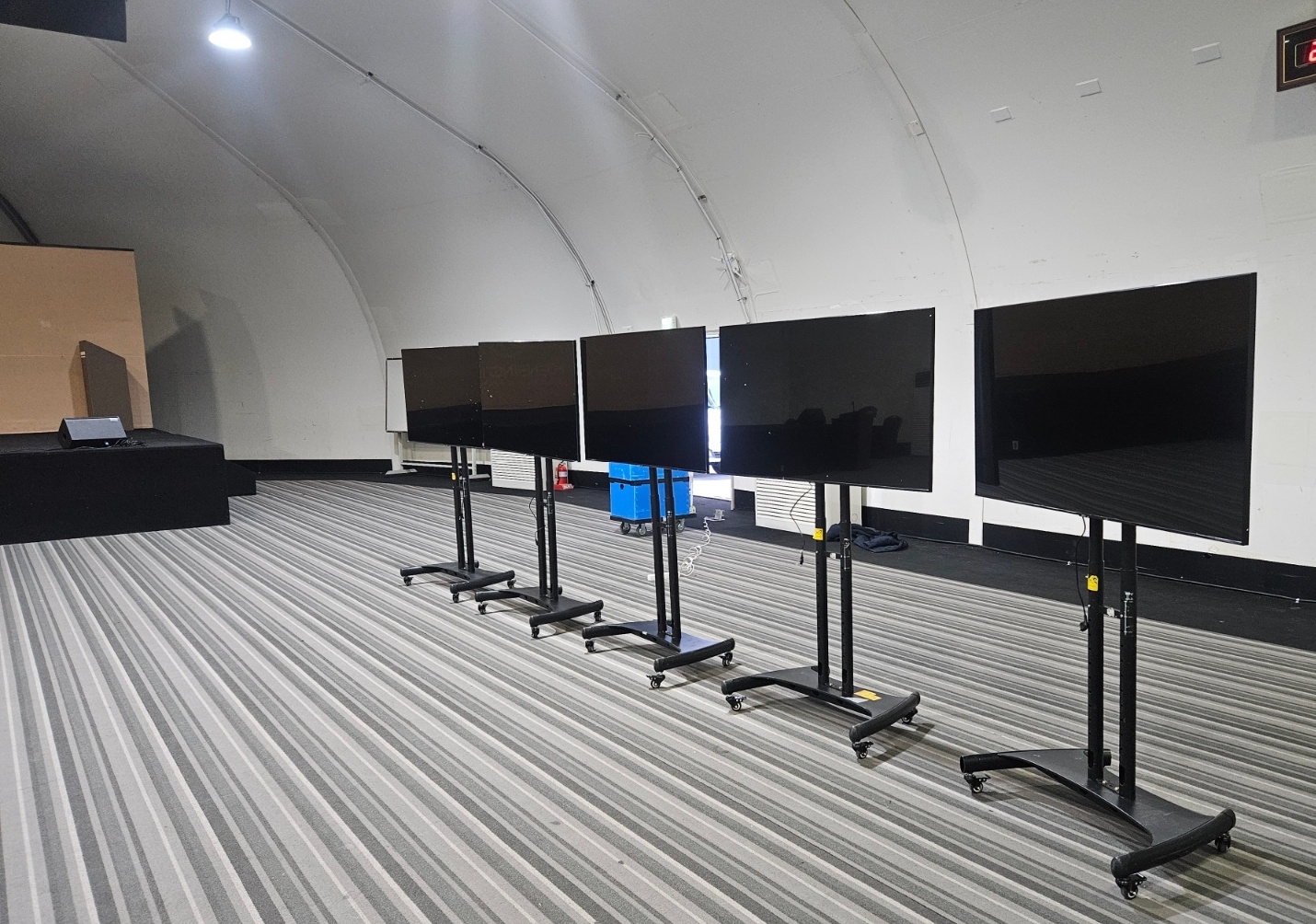튼튼한 이동형 거치대: 흔들림 없이 묵직하게 TV를 지탱해주는 스탠드를 사용했습니다. 바퀴가 달려 있어서 행사 도중 위치를 조금씩 변경하기에도 용이합니다.