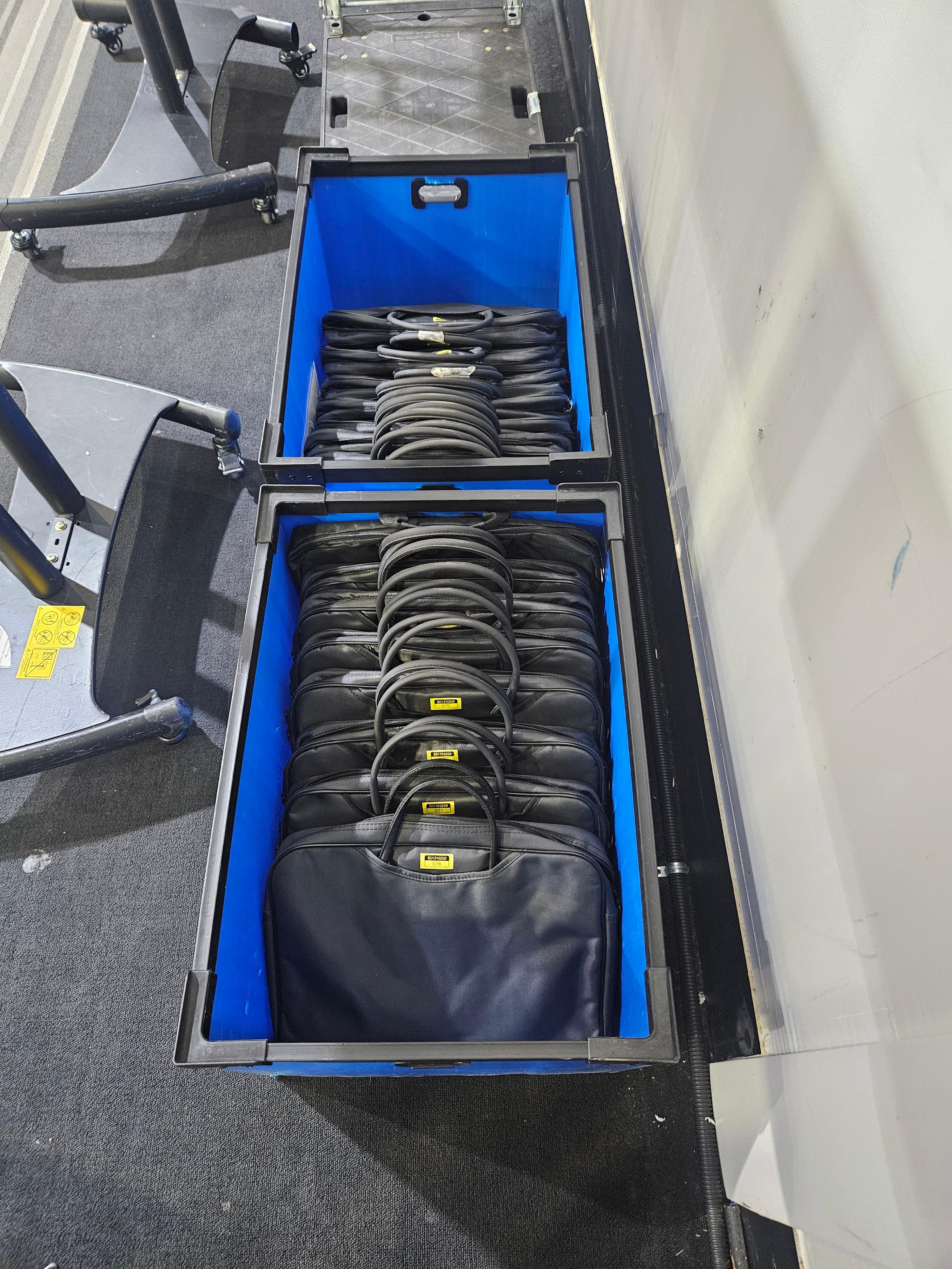 파란색 단프라 박스에 16대의 노트북 가방을 오열 맞춰 담아왔습니다. 수량이 많을 때는 이렇게 전용 박스에 담아 이동해야 충격을 방지하고, 현장에서 배포 및 수거할 때도 수량을 체크하기가 훨씬 수월합니다.