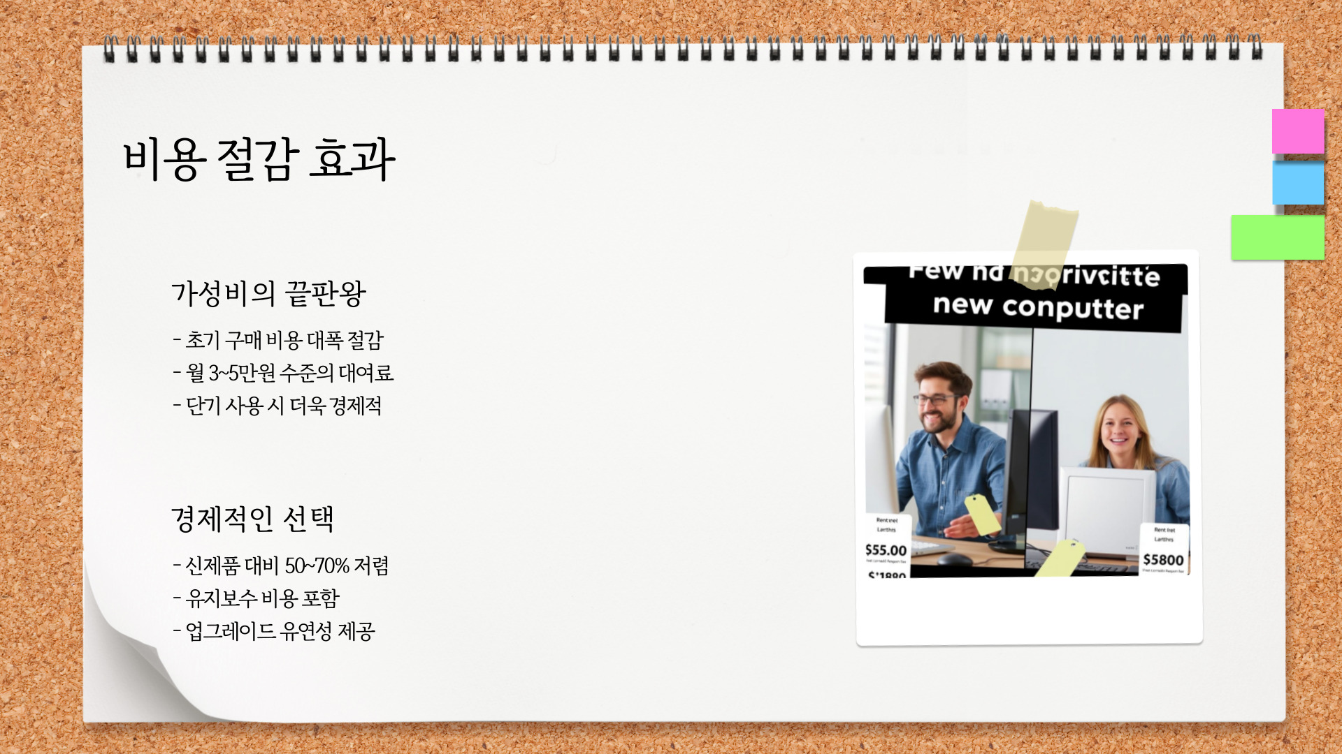 새 컴퓨터를 사려면 최소 수십만 원에서 수백만 원까지 들어요. 하지만 중고 컴퓨터를 대여하면 초기 비용이 훨씬 적게 듭니다. 예를 들어, 신형 노트북을 사려면 150만 원이 필요하지만, 중고 대여는 월 3~5만 원이면 충분할 수도 있죠. 특히 단기간 사용해야 한다면 더욱 경제적이에요.
