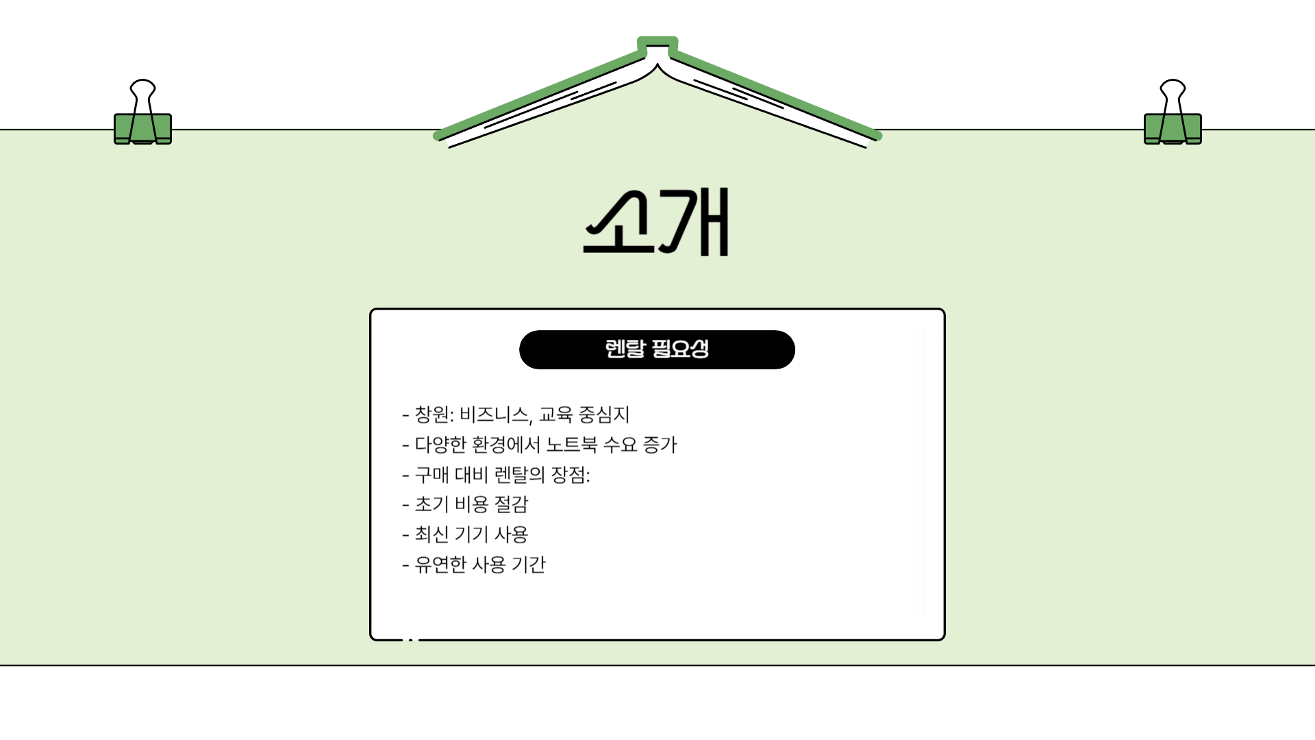 - 임시 프로젝트: 몇 주 혹은 몇 달간 진행되는 프로젝트에 맞춰 노트북을 구매하는 것은 비효율적입니다. 렌탈 서비스를 이용하면 필요한 기간만큼만 기기를 사용하고 반납할 수 있어 비용 절감이 가능합니다.