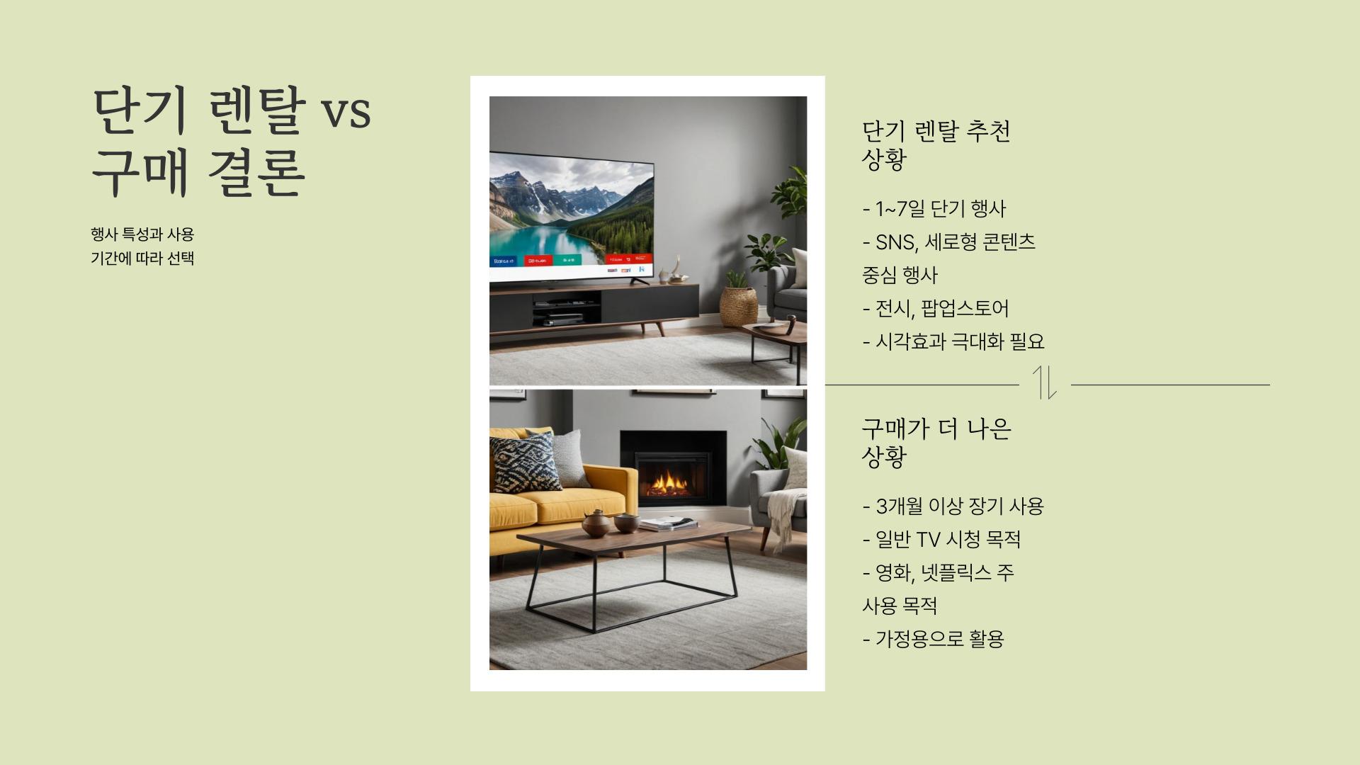 더 세로 TV를 단기 렌탈할지, 직접 구매할지 고민된다면 아래 기준을 참고해 보세요.