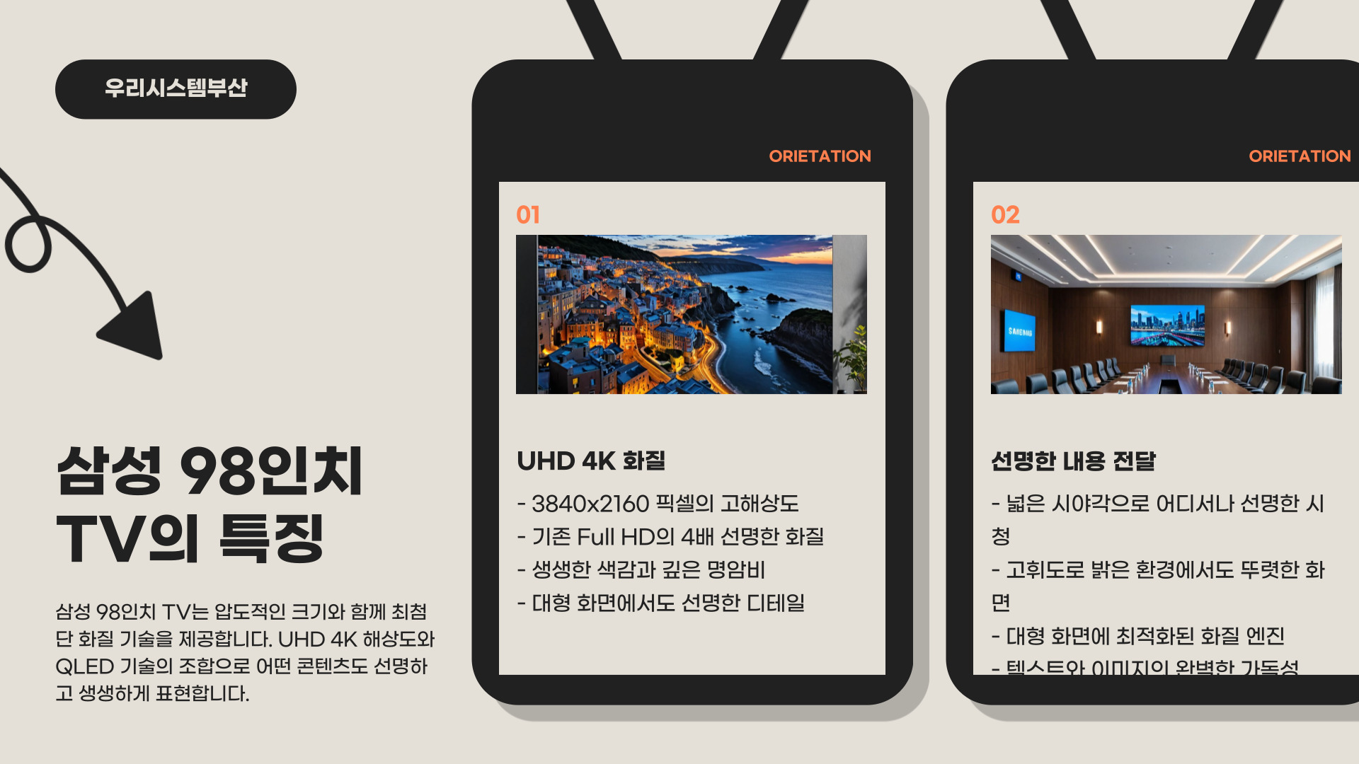 저희 우리시스템부산의 삼성 98인치 TV는 UHD 4K 화질로 행사장 어느 자리에서도 선명하게 내용을 전달할 수 있어요.