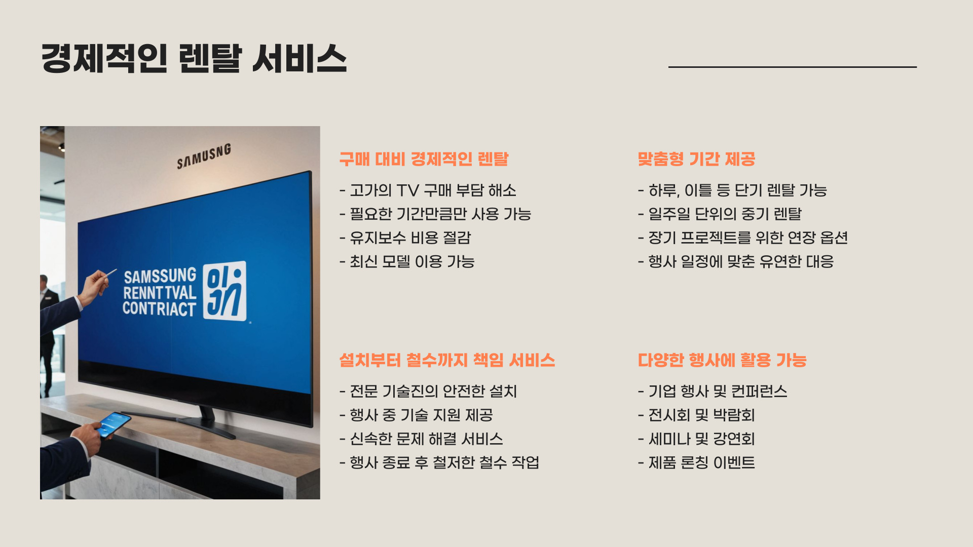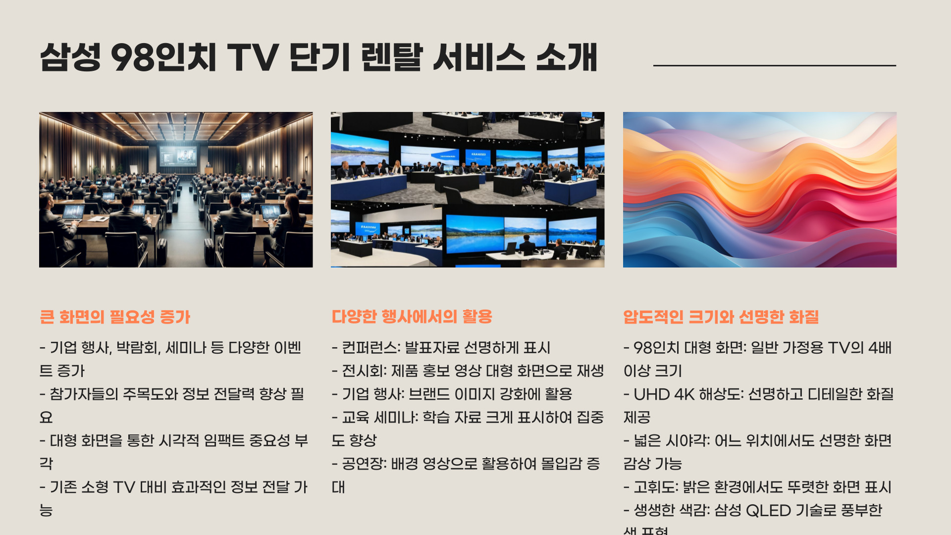 행사의 품격을 높이는 확실한 선택, 삼성 98인치 TV 단기 렌탈은 우리시스템부산과 함께하세요!