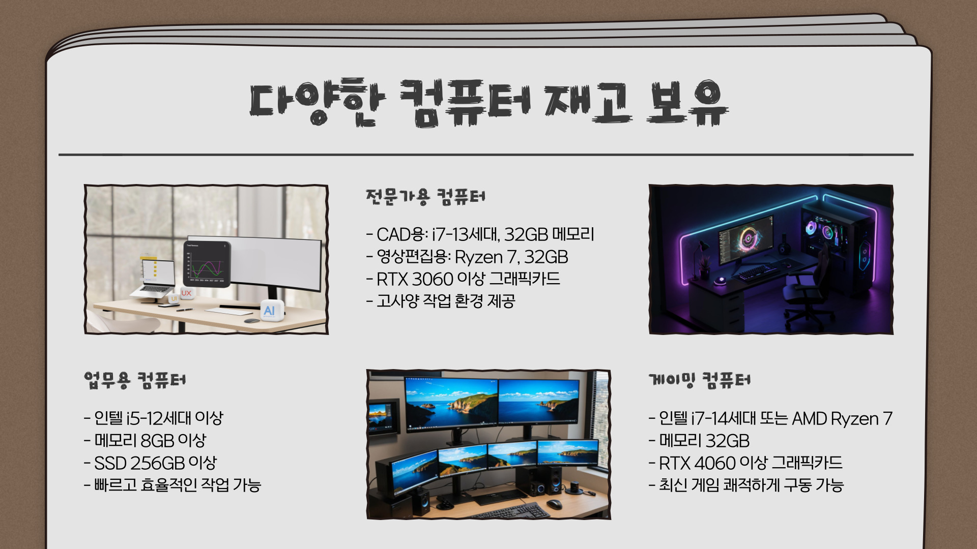 우리시스템부산의 가장 큰 장점은 바로 엄청난 수량의 다양한 컴퓨터 재고입니다. 단순 업무용 PC부터 전문적인 CAD 작업용, 이미지 편집용 컴퓨터, 그리고 요즘 인기가 폭발적인 게이밍 컴퓨터까지! 수백 대 이상의 컴퓨터를 다양한 사양으로 갖추고 있어서, 여러분이 원하는 사양을 딱 맞춰서 제공할 수 있다는 게 우리시스템부산만의 자랑이랍니다.