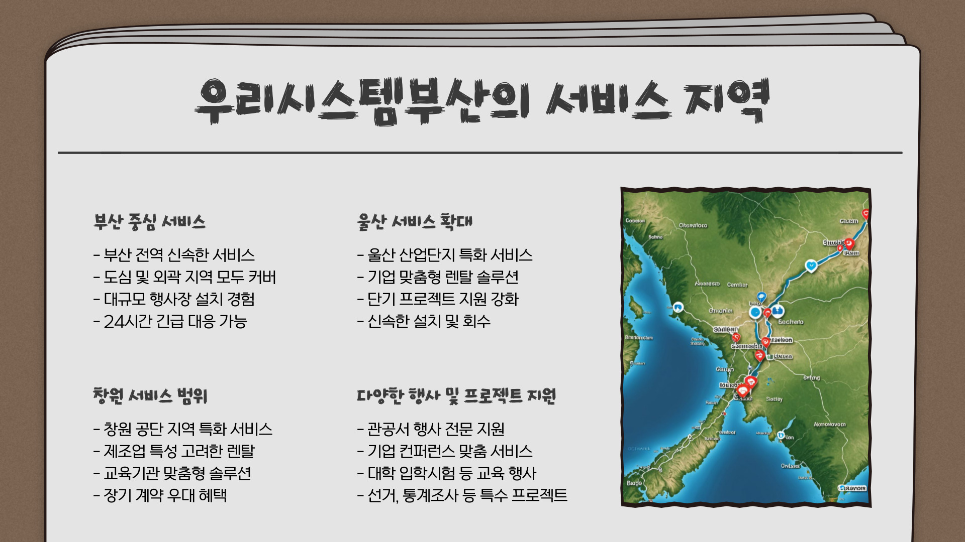 우리시스템부산은 부산을 중심으로 울산, 창원까지 폭넓게 서비스를 하고 있어요. 특히 관공서 행사, 단기 프로젝트, 기업 행사 등 컴퓨터가 급히 필요할 때 부담 없이 이용할 수 있도록 다양한 옵션을 제공하고 있죠. 말만 들어도 든든하죠?