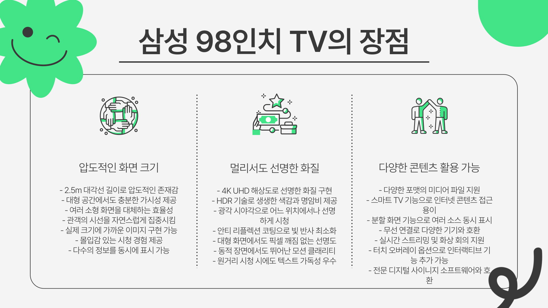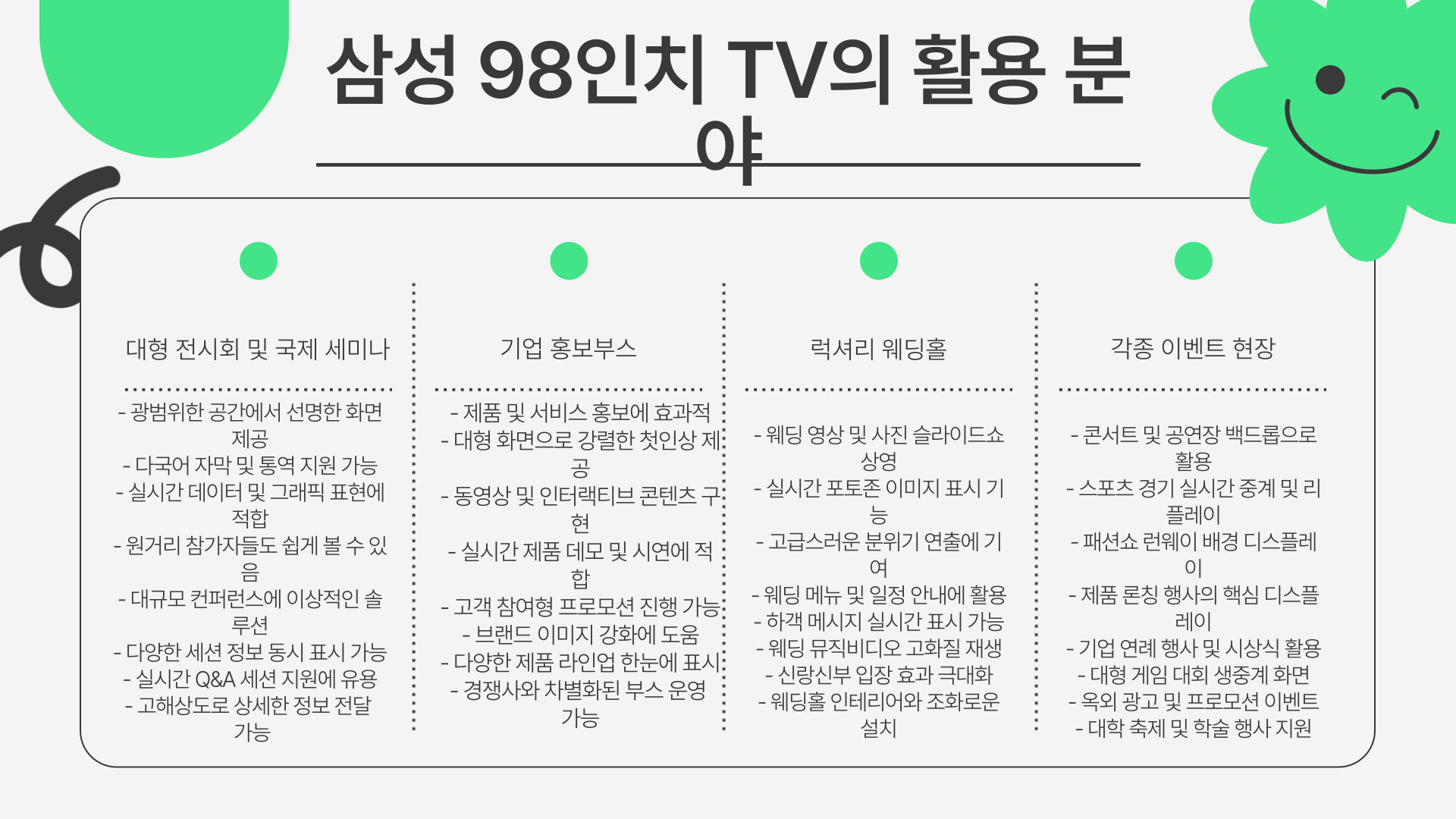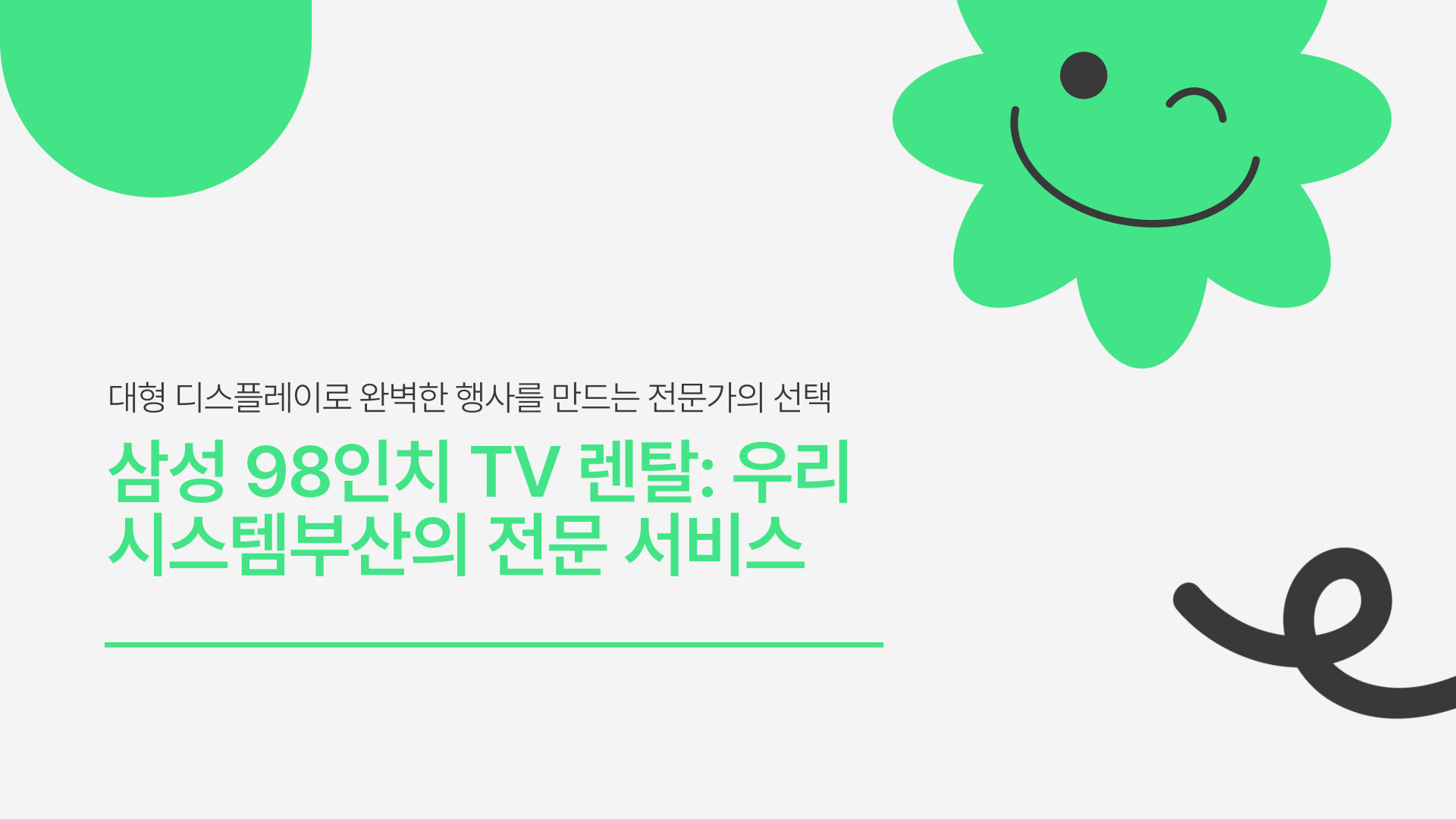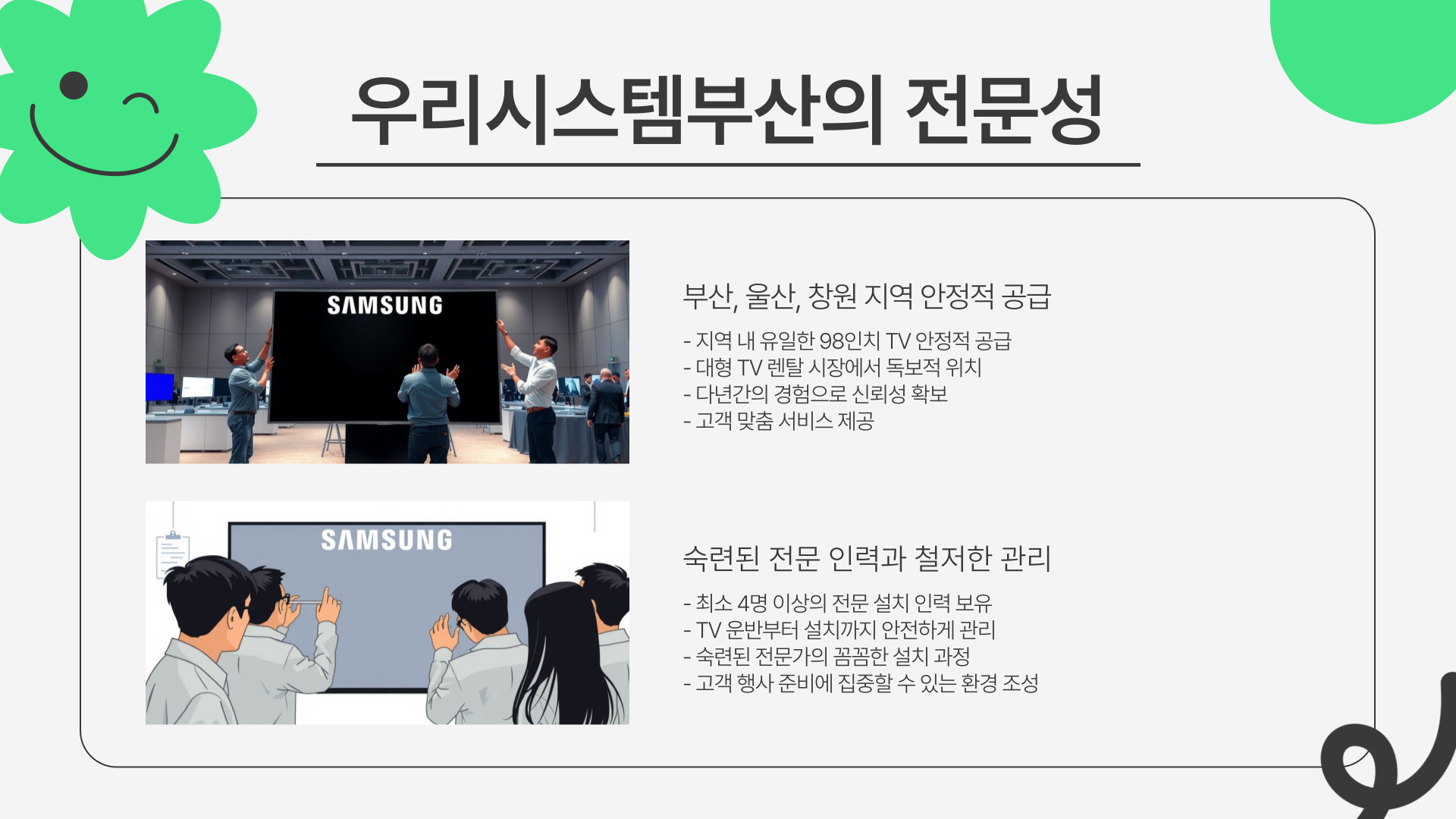 대형 TV는 설치부터 철수까지, 전문적인 업체가 아니면 힘들어요. 그러니까 여러분의 소중한 행사를 더욱 완벽하게 만들어 줄 삼성 98인치 TV 렌탈은 우리시스템부산과 함께하세요!