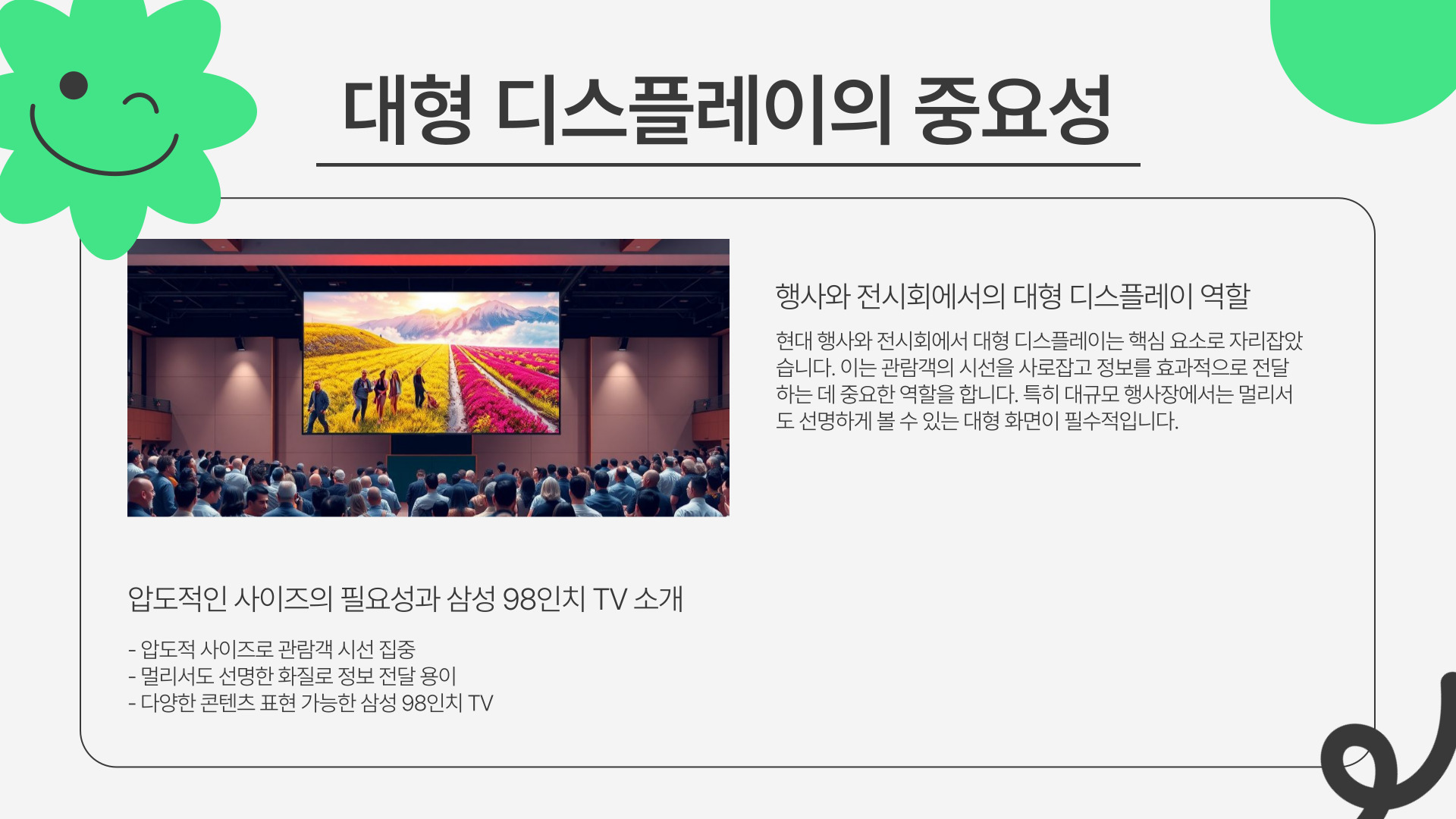 요즘 행사를 준비하거나 전시회를 개최할 때, 대형 디스플레이만큼 중요한 게 또 있을까 싶어요. 특히 사람들의 이목을 집중시키려면 일반 크기보단 압도적인 사이즈가 필요하죠. 그래서 오늘은 삼성 98인치 TV 렌탈에 대해 얘기하려고 합니다.